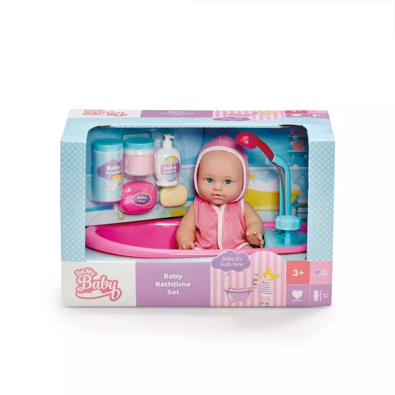 Tento sladký set ADDO panenky s vaničkou z řady Be My Baby si děti ihned zamilují. Je čas připravit panenku do postele. Osprchujte panenku odnímatelnou sprchovou hlavicí, namydlete a opláchněte. Když je panenka umytá, usušte ji a namažte krémem než ji oblečete do župánku. Po koupání je čas na ukolébavku a klidný spánek. Sada obsahuje: 1x růžová vana s modrou sprchovací plochou, 1x panenka, 1x župan, 1x plastové mýdlo v krabičce, dětský krém a pudr. Nalejte vodu do vaničky, stiskněte modrý kohoutek a voda začne vytékat ze sprchové hlavice. Výška panenky cca 30 cm. Rozměr balení: 40 x 25 x 21 cm. Věk: 3+