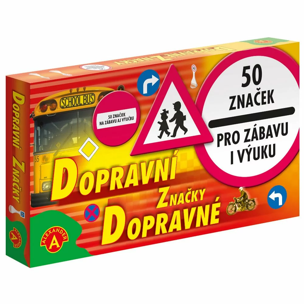 Děti se učí poznávat nejznámější dopravní značky. Balení obsahuje 50ks dopravních značek z pevného lesklého kartonu o výšce 5 cm a 50ks plastových stojánků a český a slovenský popis značek.