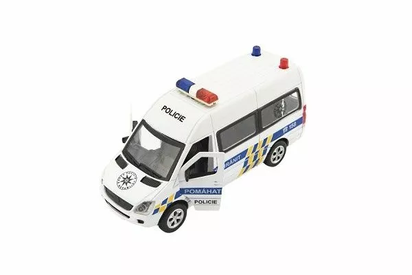 Kovové autíčko pro malé policisty je vyrobeno s plastovými doplňky. Malý model jezdí na zpětné natažení, má otevírací přední a zadní dvěře, vydává zvuky startování a houkačky, má efekty blikajících světel. Velikost dodávky je 15cm. Baterie 3x AG14 jsou součástí balení a slouží pouze pro zkušební účely.