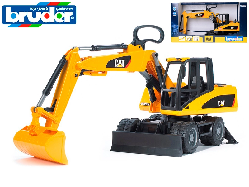 Konstrukční vozy - CAT kolové rypadlo 1:16. Tento bagr se vyznačuje moderním žluto-černým designem a především mnoha funkcemi. Pro dokonalou stabilitu je bagr vybaven dvěma opěrnými nohami a v zadní části potom radlicí, která je výškově nastavitelná a polohovatelná. Kolové rypadlo je také vybaveno bagrovacím ramenem, které je plně flexibilní a umožňuje práci na úzkém prostoru. Bagrovací rameno je možné nastavit do transportní polohy. Stroj je vyroben z kvalitního plastu,který je velmi odolný proti nárazu. Je vhodný pro interiér i exteriér.