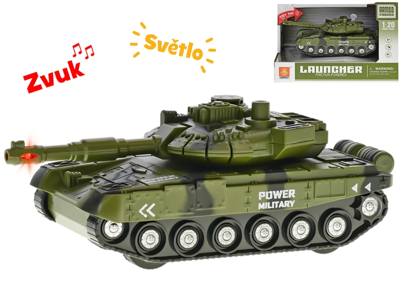 Tank 19,5cm 1:20 na setrvačník na baterie se světlem a zvukem v krabičce. Věk: 3+. Rozměr: 19,5 cm