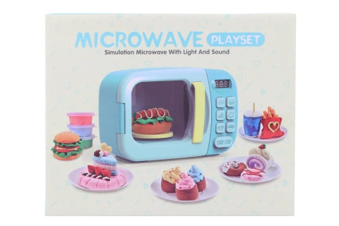 Modrá mikrovlnka s modelínou. Mikrovlnka vydává zvuky a svítí. Napájení na 2 AA baterie (jsou součástí). Součástí balení jsou dopńky - potraviny. Rozměry mikrovlnky cca 23 x 15,2 x 12 cm. Rozměry balení cca 23 x 18,5 x 12,5 cm. Věk 3+