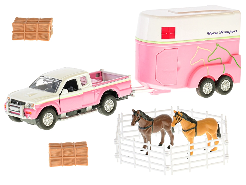 Mitsubishi růžové 13cm kov na zpětný chod s přívěsem pro koně s doplňky v krabičce. Věk: 3+