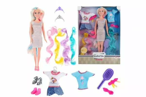 Panenka nekloubová plast 30 cm s doplňky v krabici. Součástí balení je spoustu doplňků jako oblečení, hřeben, sponky, příčesky apod. Velikost panenky cca 30 cm. Věk: 3+