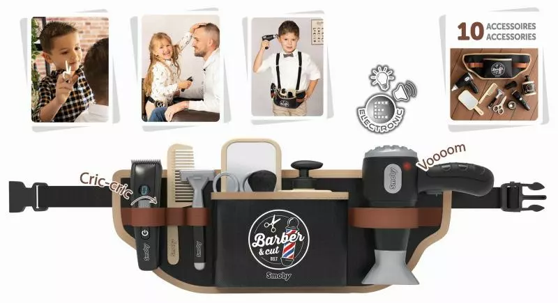 Nastavitelný holičský pás s 10 doplňky. Textilní pásek s nastavitelnou velikostí lze perfektně nastavit a snadno se nasazuje pomocí klipu vhodného pro děti. Gumičky drží deset doplňků: nůžky, mechanický zastřihovač vousů, pleťová voda, holicí strojek, zrcátko, elektronický fén se zvukem, mýdlo na ruce, hřeben a štětka na holení. Rozměry (DxŠxV): 38 x 4 x 14,5 cm. Výrobek na baterie - 2x LR03/AAA - nejsou součástí. Věk: 3+