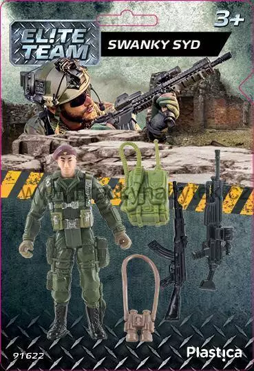 Swanky Syd- Fešák Syd - plastová figurka elitního vojáka s doplňky. Člen speciálního komanda- těžkooděnec, který je vybaven útočnou puškou Kalašnikov AK-74, velkým kulometem M249 a přenosnou rádiovou vysílačkou. Figurka má pohyblivé všechny končetiny. Rozměr balení: 12,9 x 19 x 3,2 cm. Vhodné pro děti : 3+
