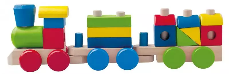 Skládací nákladní vlak obsahuje tyčky, na které je možno navlékat barevné kostky. Vlak je možno rozložit a použít jako stavebnici. Při skládání podporuje rozvoj logiky, jemné motoriky a kombinatoriky. Věk: 2+. Délka: 43 cm. Počet ks: 18