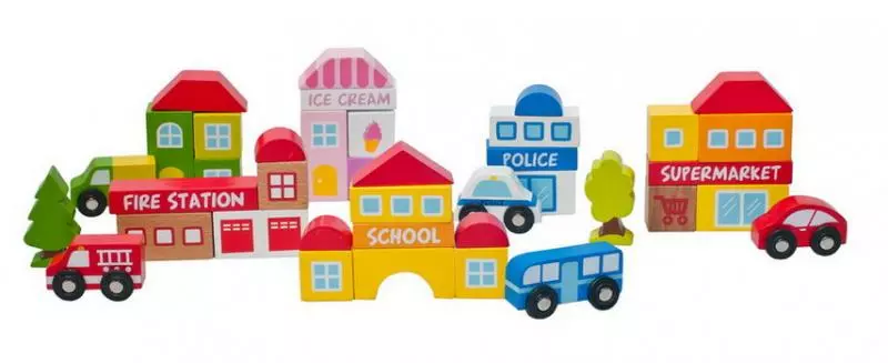 Kostičky, ze kterých si děti dle své libosti mohou postavit město hned u vlakové želznice. Z kostek mohou postavit např.: školu, hasicí stanici, obchod,.. Vyrobeno ze dřeva. Věk: 3+ Certifikát: Safe Toys. Věk: 3+