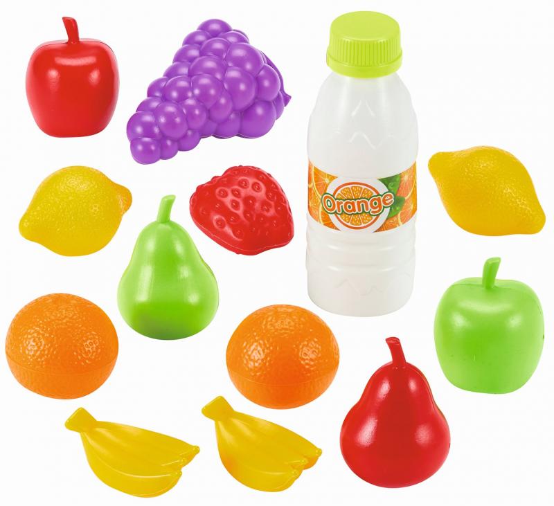 Makety potravin v síťce. Síťka obsahuje celkem 13 doplňků - 2 citrony, jahodu, 2 pomeranče, 2 jablka, 2 hrušky, 2 trsy banánů, hrozen vína a láhev pomerančového džusu. Ideální také jako vybavení obchodu nebo jako doplněk do dětské kuchyňky. Rozměry produktu (DxŠxV): 16 x 16 x 13 cm. Věk: 1,5+