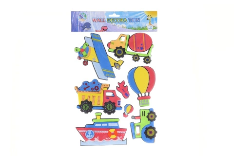 Nalepovací pěnová dekorace s motivem dopravních prostředků. Sada obsahuje 8 obrázků. Každý dopravní prostředek má jiné rozměry - největší 19x12 cm, nejmenší 3,5x5 cm. Tloušťka cca 0,3 cm. Baleno v sáčku. Rozměry balení cca 30x50 cm. Věk 3+