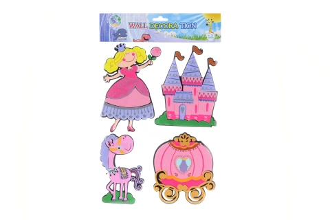Nalepovací pěnová dekorace s motivem princezny. Sada obsahuje 4 obrázky. Rozměry největšího obrázku cca 14x22 cm, nejmenšího cca 11x18 cm. Tloušťka cca 0,3 cm. Baleno v sáčku. Rozměry balení cca 30x50 cm. Věk 3+