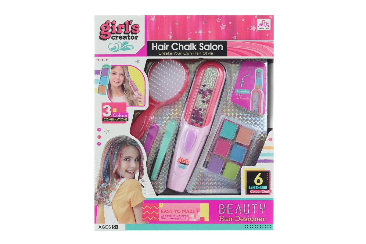Sada pro malé kadeřnice. Balení obsahuje křídy na vlasy, aplikátor, kartáč na vlasy a dvě spony. Baleno v krabici. Rozměry balení cca 26x31x6 cm. Věk 5+