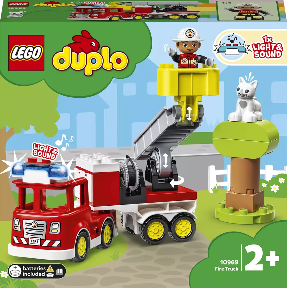 Požárnické auto nabité funkcemi – Hasičský vůz (10969) od LEGO® DUPLO® uchvátí fantazii začínajících hasičů a pomůže jim rozvíjet důležité dovednosti • Autentické detaily – Sada nabízí figurky LEGO® DUPLO® hasiče a kočičky, a k tomu navíc sestavitelný strom a multifunkční hasičský vůz s blikajícími světly a sirénou (baterie jsou součástí balení) • Zábavný rozvoj dovedností – Děti mohou zdokonalovat jemnou motoriku a rozvíjet sociální schopnosti a empatii, zatímco si přehrávají nápadité příběhy z hasičského prostředí • Skvělý dárek pro děti od 2 let – Které dítě by nemilovalo hasičské vozy? Tato stavebnice je ideální pro všechny předškoláky, kteří zbožňují úžasná vozidla a baví je starat se o zvířata • Velká zábava pro malé požárníky – Hasičský vůz měří přes 17 cm na výšku, 28 cm na délku a 17 cm na šířku. Model lze pro ještě větší porci zábavy kombinovat s dalšími stavebnicemi LEGO® DUPLO® • Chybět nesmí ani inspirativní doplňky – Zábavný obrázkový příběh na motivy stavebnice představuje snadný způsob, jak děti uvést do světa kreativního stavění a hraní • Učení hrou – Všechny stavebnice LEGO® DUPLO® byly navrženy tak, aby obsahovaly poutavé příběhy, pestré barvy, rozmanité postavy a celou řadu fascinujících detailů, které vašemu dítěti pomůžou udělat VELKÝ první krok na cestu životem • Dokonalá kvalita – Dílky LEGO® DUPLO® splňují ty nejvyšší oborové standardy, takže si můžete být jisti, že je pro malé ručky snadné kostky uchopit, umístit a rozpojit – a je tomu tak již od roku 1969 • Bezpečnost na prvním místě – Kostky a dílky LEGO® DUPLO® pouštíme na zem, drtíme, kroutíme, zahříváme a analyzujeme, abychom zajistili, že splňují striktní globální bezpečnostní standardy.