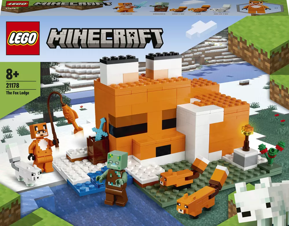 • Sada plná zábavy – Stavebnice Liščí domek (21178) od LEGO® Minecraft® doslova překypuje postavami, doplňky a funkcemi, které inspirují k nápaditému hraní bez konce • Dobře známé postavy – Patří sem kultovní postavy ze světa Minecraft®: zombie utopenec, liška, liščí mládě, polární liška a figurka hrdiny v liščím „skinu“ • Kreativní a všestranné – Díky otevřené zadní straně a odnímatelné střeše si děti mohou snadno hrát ve vnitřním prostoru. Venku na ně pak čekají zvířata, o něž se mohou starat, ryby, které si mohou nachytat, a protivník, s nímž se budou muset utkat • Ideální dárek – Tento narozeninový, vánoční nebo jakýkoli jiný dárek pro příznivce hry Minecraft® od 8 let jim pomůže posunout dobrodružství ze světa Minecraft na novou úroveň • Kompaktní velikost – Přenosná sada měřící přes 10 cm na výšku, 17 cm na šířku a 12 cm do hloubky v sobě ukrývá kompletní herní svět • Minecraft® v reálném světě – Stavebnice řady LEGO® Minecraft přinášejí fanouškům nový způsob, jak si vychutnat jejich oblíbenou hru. Součástí jsou postavy, scény a funkce tvořené pestrým mixem kostek a dílků LEGO • Záruka kvality – Součástky LEGO® splňují striktní oborové standardy kvality tak, aby byly konzistentní, kompatibilní a umožňovaly snadné spojování a rozebírání • Jistota bezpečnosti – Dílky LEGO® pouštíme na zem, zahříváme, drtíme, kroutíme a analyzujeme, abychom zajistili, že splňují náročné globální bezpečnostní standardy. Věk: 8+
