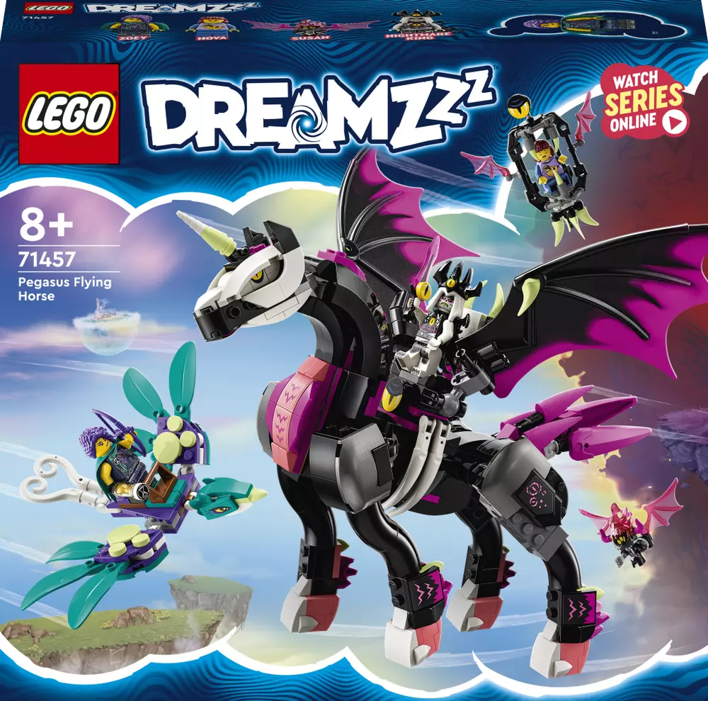 • Vdechněte příběhu život – Stavebnice LEGO® DREAMZzz™ (71457) Létající kůň pegas je založena na televizním seriálu DREAMZzz™ a vytváří pro děti prostor k nápaditému hraní • 2 možnosti stavění – Děti pomohou Zoey při záchraně Novy a postaví figurku ptáčka, nebo jí vytvoří křídla • Pohyblivé hraní – Pegas má pohyblivou hlavu, boky, kopyta a ocas, takže ho děti snadno přizpůsobí různým vymyšleným scénám • Propracované detaily – Trůn Krále nočních můr a Zoeyina ptáčka lze připojit na pegasova záda • 3 minifigurky – Stavebnice obsahuje minifigurky Zoey, Novy a Krále nočních můr a navíc figurku Susan • Spousta zábavy – Tato stavebnice je navržena pro děti od 8 let, které baví trávit hodiny stavěním samostatně nebo s kamarády • Rozměry – Ve své největší podobě měří létající kůň pegas přes 20 cm na výšku • Usnadnění stavění – Stavebnice obsahuje návod na stavění vedený příběhem, který je také k dispozici v digitální verzi v aplikaci LEGO® Builder • Prémiové kostky LEGO® jsou navrženy tak, aby šly vždy snadno spojovat • Bezpečnost zajištěna – Kostky LEGO® jsou důkladně testovány, aby splňovaly přísné bezpečnostní standardy.