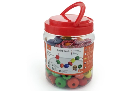 Plastová dóza obsahuje velké dřevěné korálky a barevné tkaničky na které lze korálky navlékat. Rozměr korálku cca 2 x 2 cm dle druhu. Rozměry balení cca 16 x 12 cm. Obsahuje 90 korálků a 5 provázků. Věk 3+