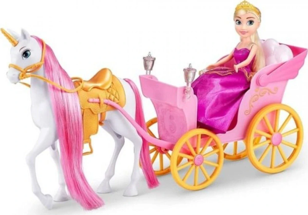 Princezna Sparkle Girlz, která má překrásné šatičky a je veliká 28 cm. Součástí sady je kůň a kočár. Věk: 3+. Rozměr balení: 54 × 15 × 31 cm.