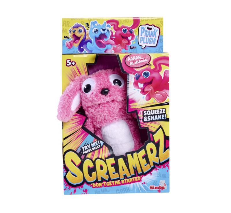 ScreamerZ, zábavný plyšák s bláznivýma očima a legračními zvukovými efekty. Lehce mu stiskni bříško a vydá roztomilý zvuk, stiskni více a začne křičet, stiskni ještě více a zatřepej s ním a on bude roztřeseně ječet. Velikost 30 cm. Barva růžová. Věk: 5+. Výrobek na baterie - 2x 1,5V - R03 AAA - jsou součástí.