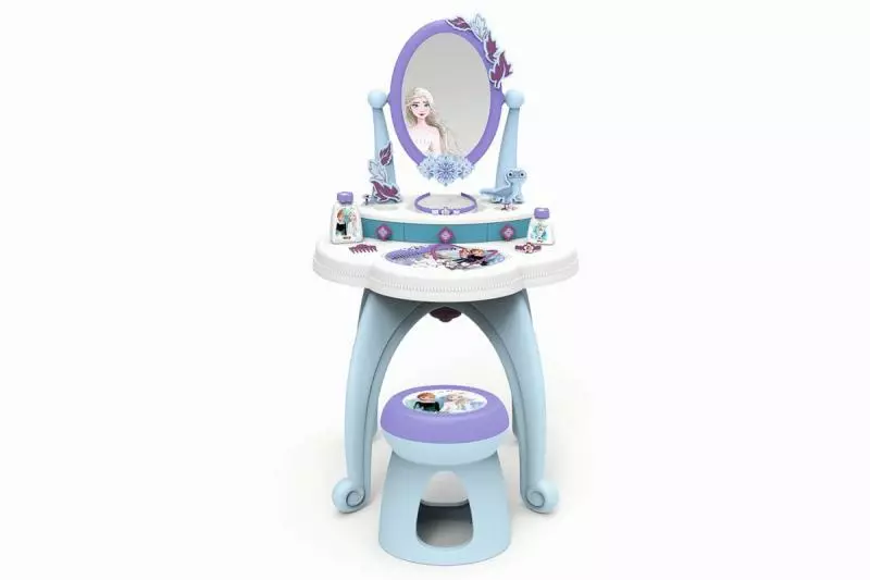 Robustní toaletní stolek se stoličkou a s velkým otočným zrcadlem je navržen v oblíbených barvách ledové královny Elsy a její sestry Anny. Součástí jsou lahvičky na parfémy, hřeben, čelenka, náhrdelník, hřeben do vlasů, náramek a 3 prsteny. Četné odkládací plochy jsou praktické a lze je využít k uložení veškerého příslušenství. Všechny použité materiály splňují nejvyšší požadavky na kvalitu pro dlouhou a bezstarostnou herní zábavu. Rozměry produktu (DxŠxV): 49 x 36 x 87 cm. Věk: 3+