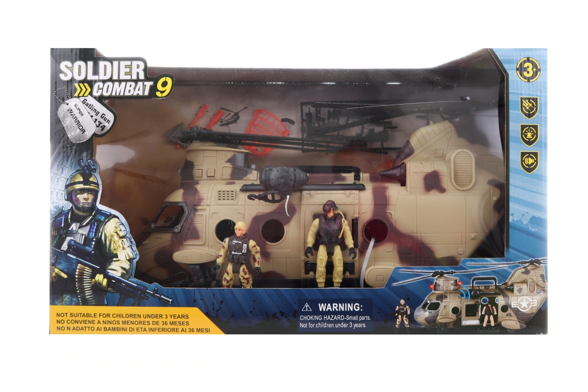 Vojenská sada s velkou helikoptérou. Materiál plast. Napájení na 2xAA baterie, které nejsou součástí balení. Po vložení baterií helikoptéra svítí a vydává zvuky. Baleno v krabici. Rozměry balení cca 55x32x20 cm. Věk 3+