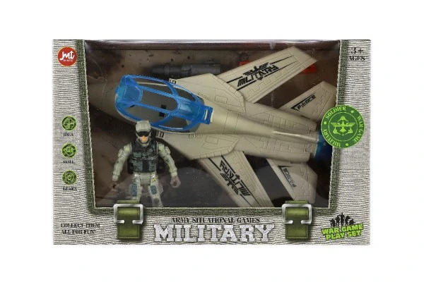 - Vojenská sada stíhačka + voják s doplňky plast v krabici 27x18x12cm